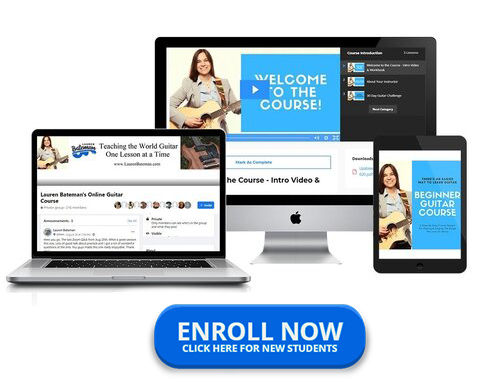 Click on the Facebook icon to join Lauren's Beginner Guitar Lesson Facebook Group where you can ask questions and interact with Lauren and her staff live on Facebook.