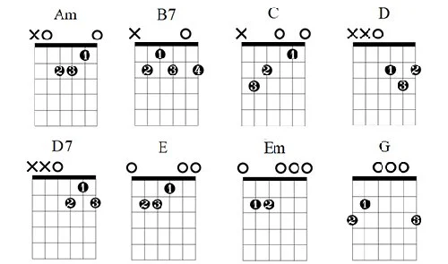 Am, B7, C, D, D7, E, Em, G
